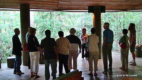 房子參觀完之後就是自由參觀時間,我們走到的最好的照相地點,這也是能真正看到落水山莊全貌的地方,真是驚為天人,難怪要被稱為世界上獨一無二的房子.我們這一團裡好像有幾位是建築師,不僅問的問題很專業,每每看到萊特對於線條,空間,借景的運用,屢屢發出讚嘆.