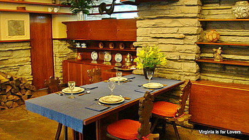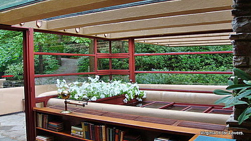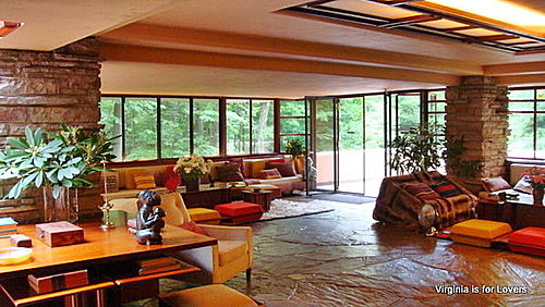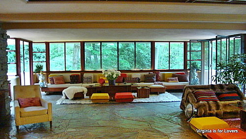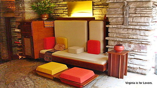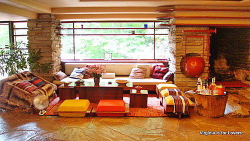 客廳的另一個角落也佈置得很舒適,讓人可以在這邊慵懶的享受這邊的自然美景.這些家具也大多是由萊特親自設計,所以屋內的整體感就是很搭調.