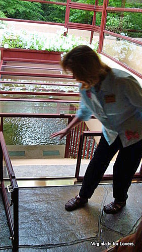 眼光往下看,這真的是蓋在瀑布上的房子順著階梯走下去就可以親近水,能把房子建築與自然美景合而為一,老公就說這就是萊特的創意!