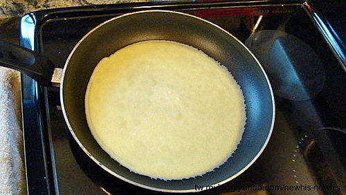 7.加入一匙的麵糊到預熱好的平底鍋,盡可能快速的將麵糊攤開至整個鍋面。