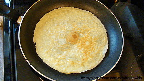 等到麵糊開始變乾,麵糊的邊緣會呈現淡咖啡色,將餅皮輕輕翻面續煎。