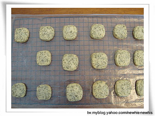 8.從冰箱拿出麵團,將麵團切成大約一公分厚度(老師說寬度都要一致,等下烤出來品質才會一致)的塊狀,放在烤盤上.(老師說要保持適當的寬度,因為麵團烤了之後會變大,預留寬度才不會讓餅乾黏在一起)
